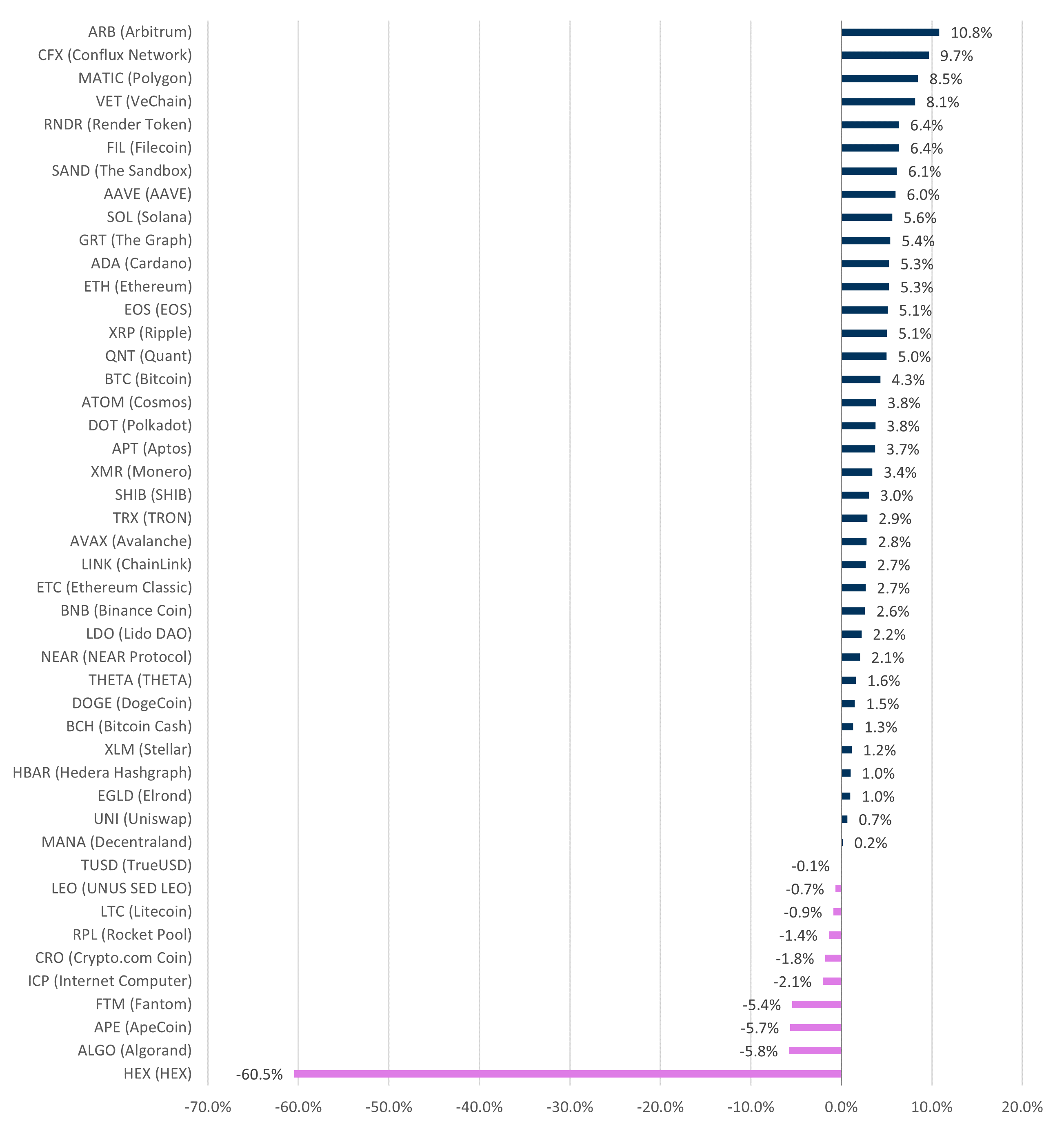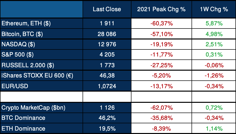 Cryptocurrencies outperformed the US and EU equity markets, with Ether (ETH) trading at approximately 1,911 USDT at the close of the week, up by 5.8% compared to the previous week, while Bitcoin ended the week at 28,086 USDT, up by almost 5.0%. Meanwhile, the US stock market closed higher, with the NASDAQ index increasing by 2.5% and the S&P 500 up by 0.3%. However, the European top 600 stocks index closed lower by 1.3%, and the Eurodollar also closed lower by roughly 0.3%.