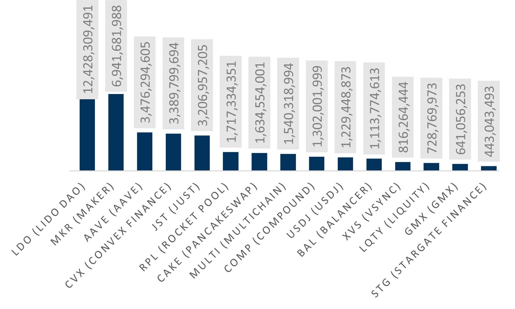 Top projects with the highest Total Value Locked (TVL) include Lido, Maker, AAVE