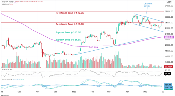 Trade setup: After topping out at $31K, price has been consolidating in a Channel Down pattern. We wait for a breakout. Bullish breakout above $28K would indicate Uptrend resumption, with upside to $32K resistance. Bearish breakout below $25K would indicate onset of downtrend, with downside risk to $21.5K thereafter.