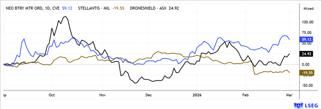 Over the past 6 months, NEO Battery Materials has significantly outperformed its peer group. No wonder, because the fundamentals are right. Stellantis has slipped significantly, and DroneShield is in the process of regaining valuable trust. Source: LSEG as of March 3, 2026